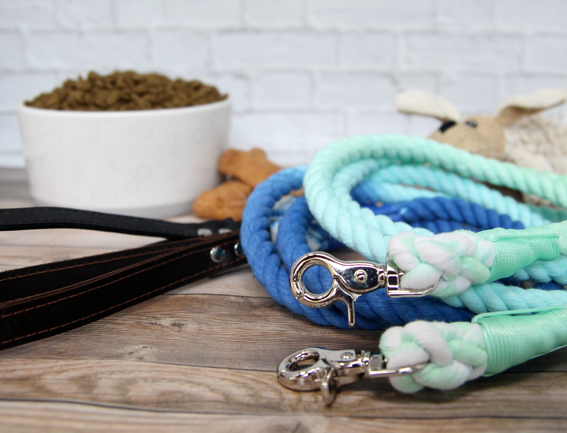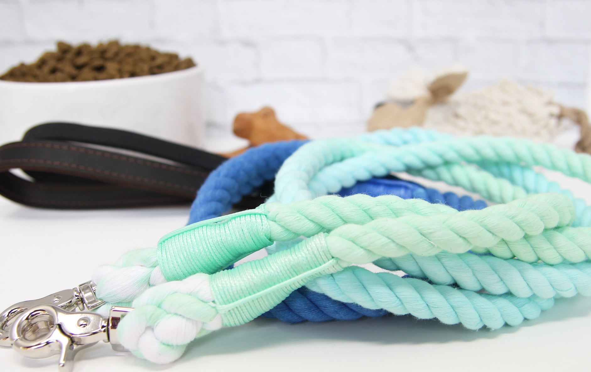 This beautiful ombre rope leash can be made with a black or brown leather handle. We designed this leash with comfort in mind, our premium leather handles provide comfort with strength which provides an attractive result.