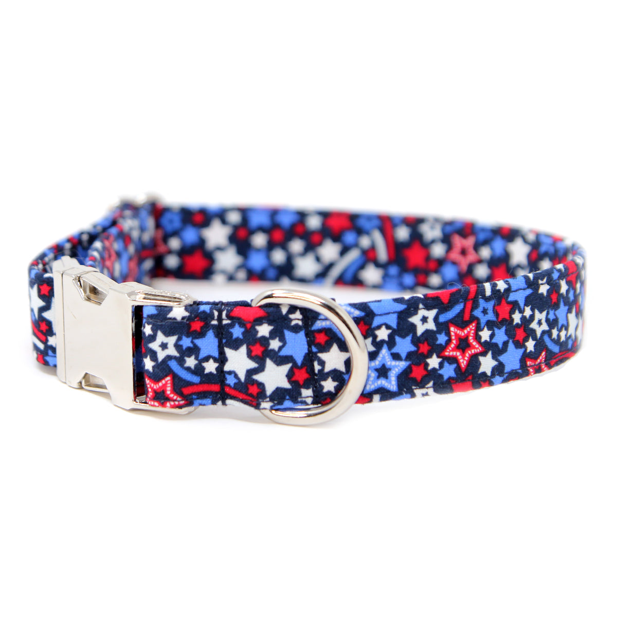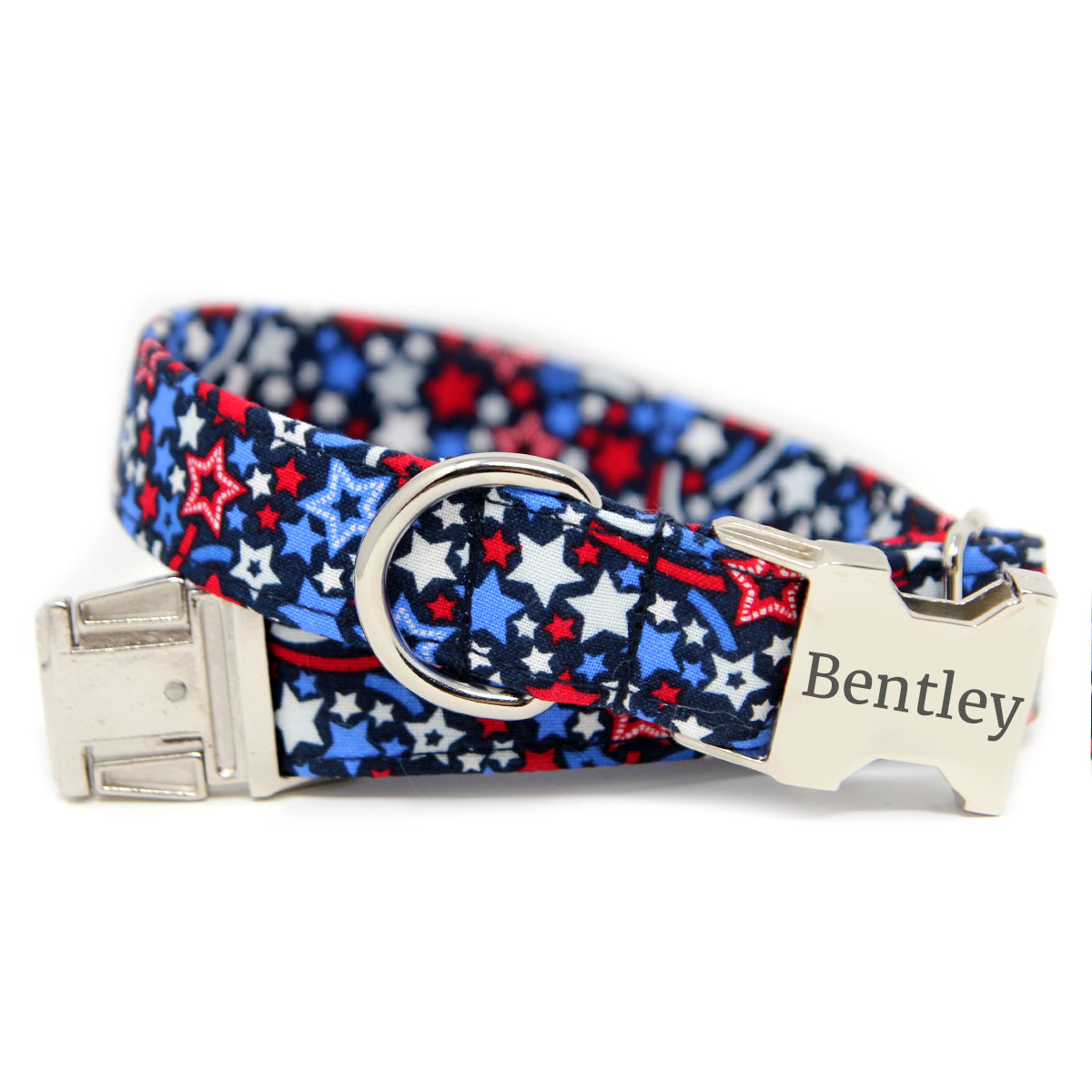 Celebrate the 4th of July in style with our custom dog collar featuring shooting stars! Your furry friend will be the most patriotic pup on the block with this custom dog collar.